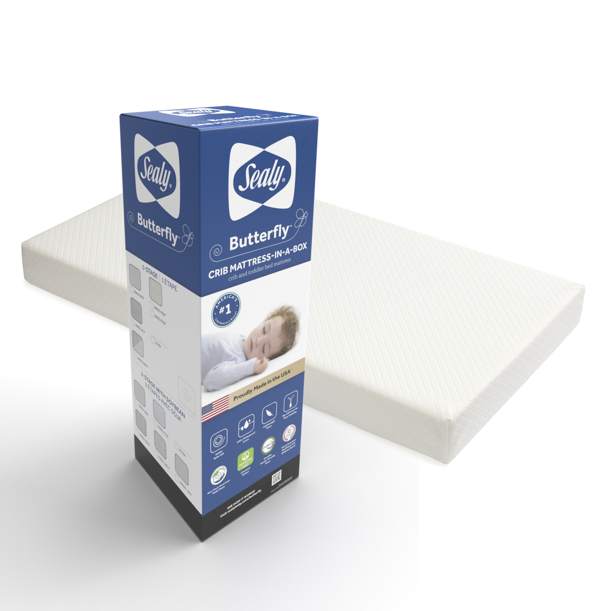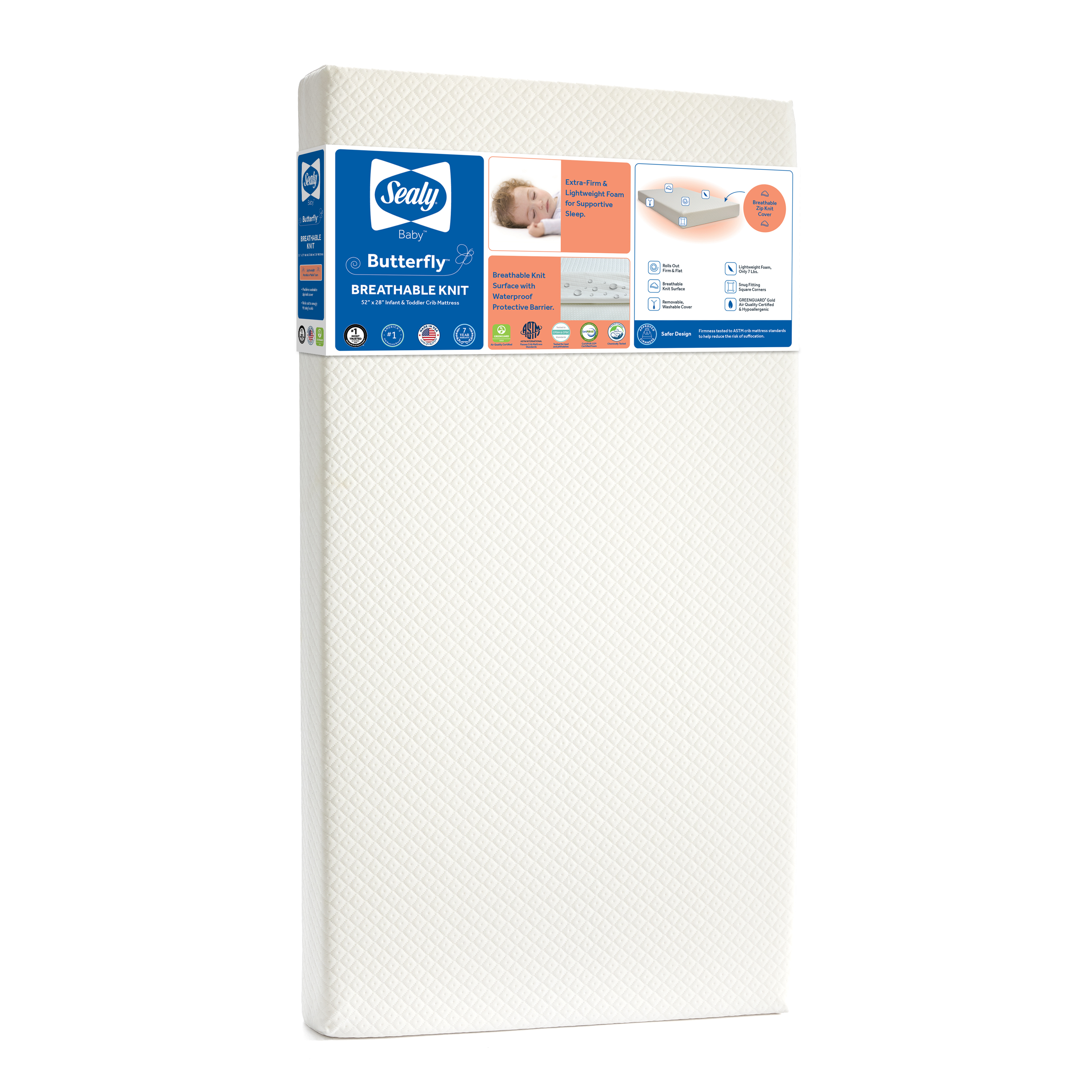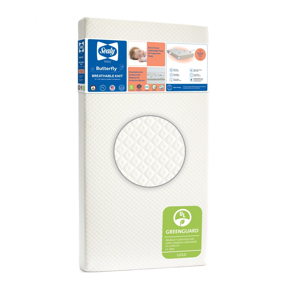 Sealy Butterfly Breathable Knit Crib and Toddler Mattress – EM900-BBX Model: EM900-BBX1 | Part: EM900-BBX1 Added by Alissa Pocius on July 18, 2022 Categories:Bedding > Mattress > Sealy Mattress Tags: Available Images and Media Main Image Marketing Images Product Image Original: 3300 x 3300 Swatch: 150 x 150 Medium: 800 x 800 Large: 1000 x 1000 Additional Marketing Images Beauty shot Original: 3300 x 3300 Swatch: 150 x 150 Medium: 800 x 800 Large: 1000 x 1000 Beauty shot w/ GG logo Original: 3300 x 3300 Swatch: 150 x 150 Medium: 800 x 800 Large: 1000 x 1000 Unbox. Unroll. Enjoy. Original: 2000 x 2000 Swatch: 150 x 150 Medium: 800 x 800 Large: 1000 x 1000 Package w/ mattress Original: 2000 x 2000 Swatch: 150 x 150 Medium: 800 x 800 Large: 1000 x 1000 Package w/o mattress Original: 1121 x 1122 Swatch: 150 x 150 Medium: 800 x 800 Large: 1000 x 1000 Snugfit promise Original: 2000 x 2000 Swatch: 150 x 150 Medium: 800 x 800 Large: 1000 x 1000 Exploded view Original: 2000 x 2000 Swatch: 150 x 150 Medium: 800 x 800 Large: 1000 x 1000 Certifications Original: 2000 x 2000 Swatch: 150 x 150 Medium: 800 x 800 Large: 1000 x 1000 Waterproof Original: 2000 x 2000 Swatch: 150 x 150 Medium: 800 x 800 Large: 1000 x 1000 Dimensions Original: 2000 x 2000 Swatch: 150 x 150 Medium: 800 x 800 Large: 1000 x 1000 Zip off cover Original: 2000 x 2000 Swatch: 150 x 150 Medium: 800 x 800 Large: 1000 x 1000 Machine washable Original: 2000 x 2000 Swatch: 150 x 150 Medium: 800 x 800 Large: 1000 x 1000 Voted #1 Original: 2000 x 2000 Swatch: 150 x 150 Medium: 800 x 800 Large: 1000 x 1000 Firm and Safe Original: 3013 x 3013 Swatch: 150 x 150 Medium: 800 x 800 Large: 1000 x 1000 Air quality certified Original: 800 x 800 Swatch: 150 x 150 Medium: 800 x 800 Large: 800 x 800