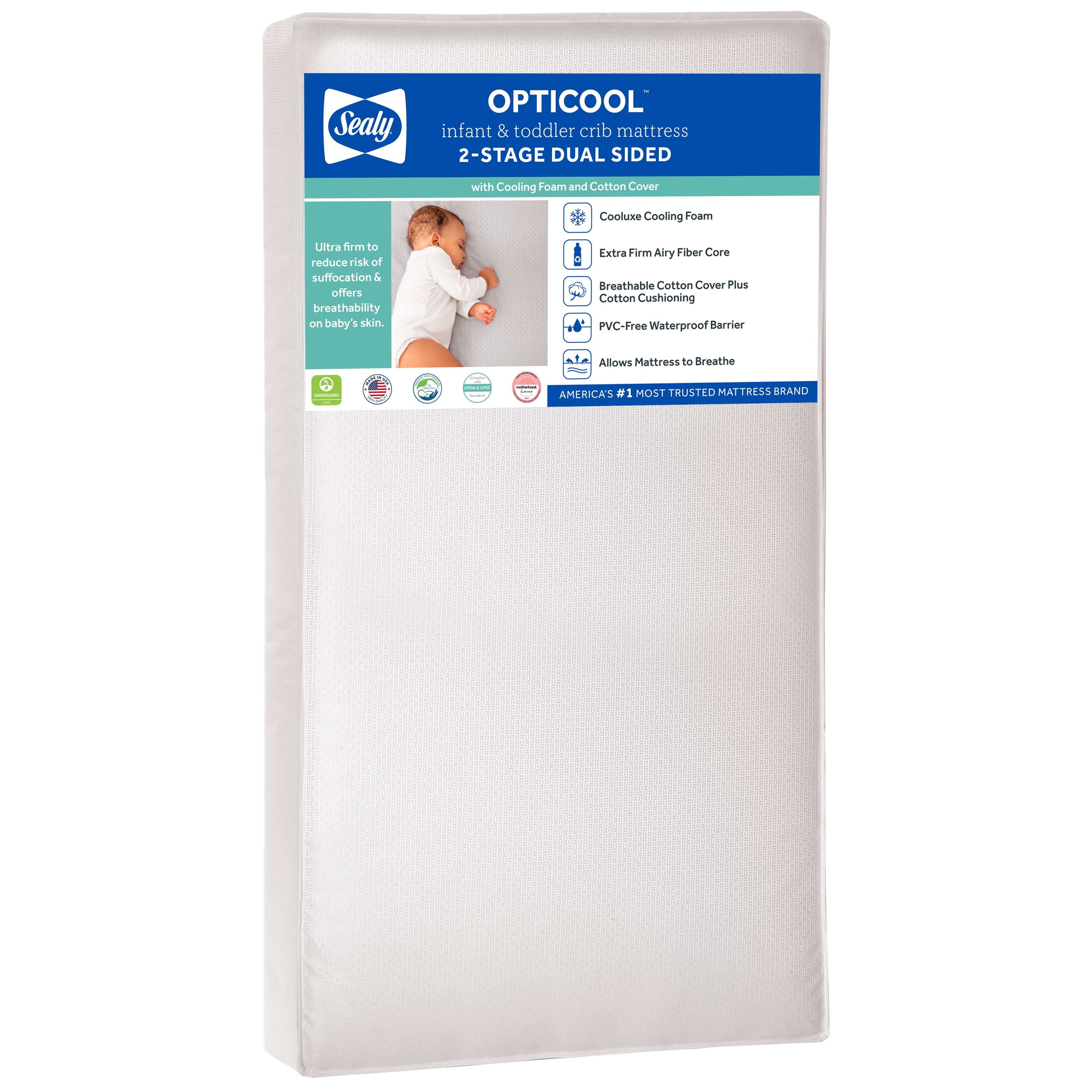 Sealy OptiCool 2-Stage Crib and Toddler Mattress Model: EM822-GTS1 | Part: EM822-GTS1 Added by Alissa Pocius on July 18, 2022 Categories:Mattress > Sealy Mattress Tags: Available Images and Media Main Image Marketing Images Product Image Original: 3300 x 3300 Swatch: 150 x 150 Medium: 800 x 800 Large: 1000 x 1000 Additional Marketing Images Beauty shot Original: 3300 x 3300 Swatch: 150 x 150 Medium: 800 x 800 Large: 1000 x 1000 Beauty shot - GG/CP logo Original: 3300 x 3300 Swatch: 150 x 150 Medium: 800 x 800 Large: 1000 x 1000 Mattress in crib Original: 2000 x 2000 Swatch: 150 x 150 Medium: 800 x 800 Large: 1000 x 1000 Exploded view Original: 2000 x 2000 Swatch: 150 x 150 Medium: 800 x 800 Large: 1000 x 1000 Certifications Original: 2000 x 2000 Swatch: 150 x 150 Medium: 800 x 800 Large: 1000 x 1000 Waterproof Original: 2000 x 2000 Swatch: 150 x 150 Medium: 800 x 800 Large: 1000 x 1000 Sizing lying down Original: 2000 x 2000 Swatch: 150 x 150 Medium: 800 x 800 Large: 1000 x 1000 Natural cotton Original: 2000 x 2000 Swatch: 150 x 150 Medium: 800 x 800 Large: 1000 x 1000 Cooling gel Original: 2000 x 2000 Swatch: 150 x 150 Medium: 800 x 800 Large: 1000 x 1000 Sustainable Original: 2000 x 2000 Swatch: 150 x 150 Medium: 800 x 800 Large: 1000 x 1000 2-Stage Original: 2000 x 2000 Swatch: 150 x 150 Medium: 800 x 800 Large: 1000 x 1000 Positioning Original: 2000 x 2000 Swatch: 150 x 150 Medium: 800 x 800 Large: 1000 x 1000 Air quality certified Original: 800 x 800 Swatch: 150 x 150 Medium: 800 x 800 Large: 800 x 800 Voted #1 Original: 2000 x 2000 Swatch: 150 x 150 Medium: 800 x 800 Large: 1000 x 1000 America's #1 Original: 2000 x 2000 Swatch: 150 x 150 Medium: 800 x 800 Large: 1000 x 1000 Breathable & Safe Original: 2000 x 2000 Swatch: 150 x 150 Medium: 800 x 800 Large: 1000 x 1000 2-Stage Firmness Original: 2000 x 2000 Swatch: 150 x 150 Medium: 800 x 800 Large: 1000 x 1000 Waterproof protection Original: 2000 x 2000 Swatch: 150 x 150 Medium: 800 x 800 Large: 1000 x 1000 Certified quality Original: 2000 x 2000 Swatch: 150 x 150 Medium: 800 x 800 Large: 1000 x 1000 America's #1 mattress brand Original: 2000 x 2000 Swatch: 150 x 150 Medium: 800 x 800 Large: 1000 x 1000