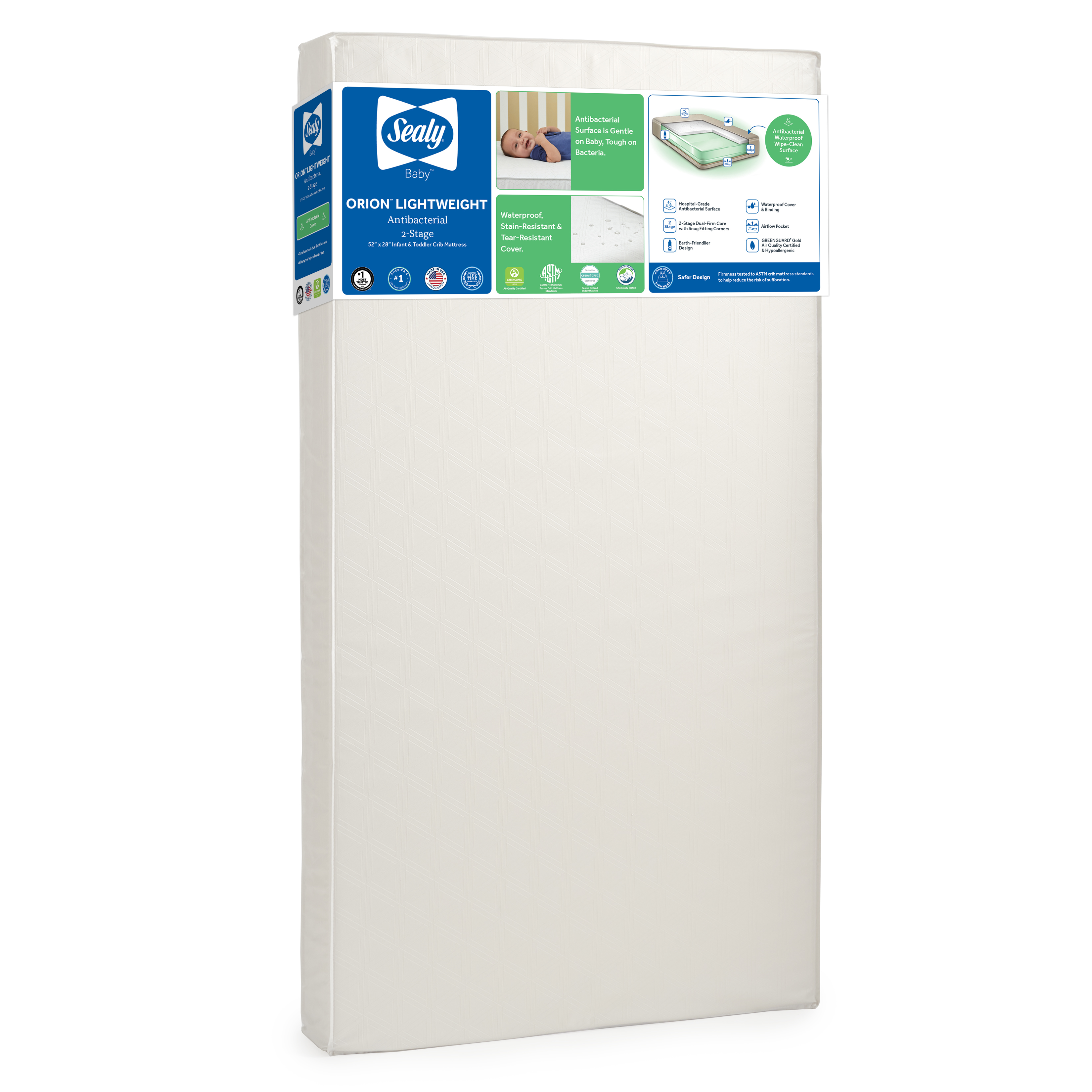 Sealy Orion Antibacterial 2-Stage Crib Mattress Model: EM016-MGR Added by Tejaswita Sawant on July 20, 2023 Categories:Bedding > Mattress > Sealy Tags: Available Images and Media Main Image Marketing Images Product Image Original: 3300 x 3300 Swatch: 150 x 150 Medium: 800 x 800 Large: 1000 x 1000 Additional Marketing Images Beauty shot Original: 3300 x 3300 Swatch: 150 x 150 Medium: 800 x 800 Large: 1000 x 1000 Beauty shot w/ GG Original: 3300 x 3300 Swatch: 150 x 150 Medium: 800 x 800 Large: 1000 x 1000 Lifestyle Original: 2000 x 2000 Swatch: 150 x 150 Medium: 800 x 800 Large: 1000 x 1000 Exploded Original: 2000 x 2000 Swatch: 150 x 150 Medium: 800 x 800 Large: 1000 x 1000 Certifications Original: 2000 x 2000 Swatch: 150 x 150 Medium: 800 x 800 Large: 1000 x 1000 Waterproof Original: 2000 x 2000 Swatch: 150 x 150 Medium: 800 x 800 Large: 1000 x 1000 Lying down Original: 2000 x 2000 Swatch: 150 x 150 Medium: 800 x 800 Large: 1000 x 1000 Made in USA Original: 2000 x 2000 Swatch: 150 x 150 Medium: 800 x 800 Large: 1000 x 1000 2-STAGE Original: 2000 x 2000 Swatch: 150 x 150 Medium: 800 x 800 Large: 1000 x 1000 Sustainable Original: 2000 x 2000 Swatch: 150 x 150 Medium: 800 x 800 Large: 1000 x 1000 Voted #1 Original: 2000 x 2000 Swatch: 150 x 150 Medium: 800 x 800 Large: 1000 x 1000 Positioning Original: 2000 x 2000 Swatch: 150 x 150 Medium: 800 x 800 Large: 1000 x 1000 Square corner Original: 2000 x 2000 Swatch: 150 x 150 Medium: 800 x 800 Large: 1000 x 1000 Hospital-Grade Original: 2000 x 2000 Swatch: 150 x 150 Medium: 800 x 800 Large: 1000 x 1000 Posture support Original: 2000 x 2000 Swatch: 150 x 150 Medium: 800 x 800 Large: 1000 x 1000 Air quality certified Original: 800 x 800 Swatch: 150 x 150 Medium: 800 x 800 Large: 800 x 800